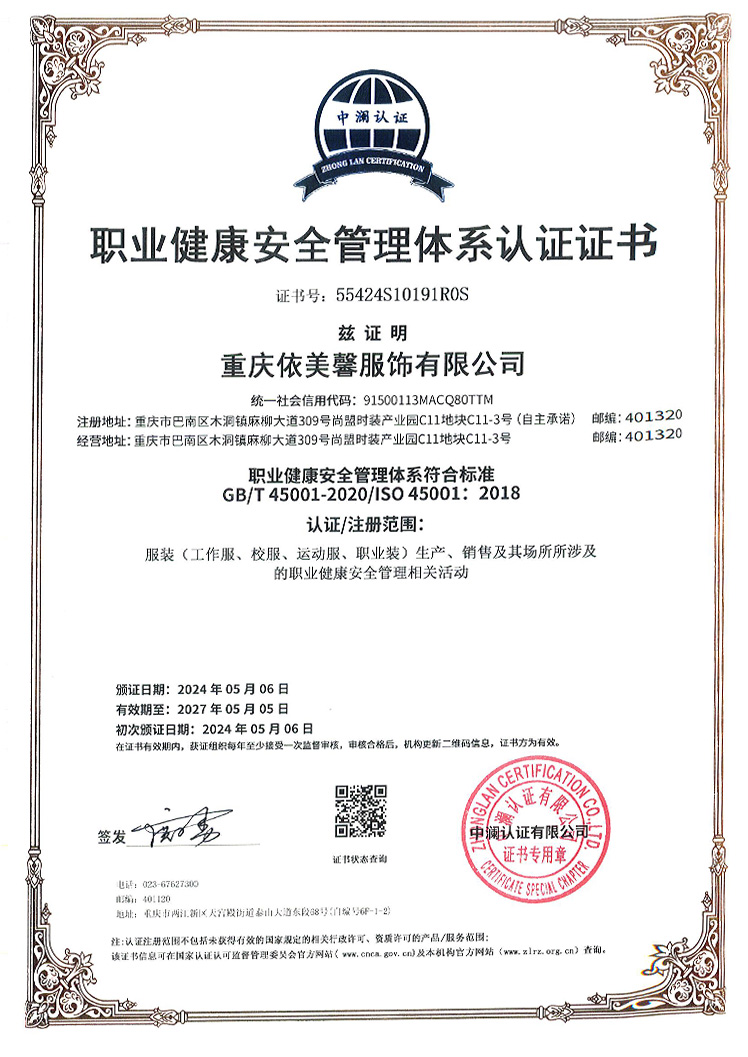 公司成立于2023年(nián)8月(yuè),座落于重慶服裝生("λshēng)産基地(dì)-巴南(nán)區(q'↓ū)木(mù)洞鎮尚盟服裝産業(yè)園C區(qū₩), 公司取了(lβ↓e)ISO9001質量管理(lǐ)體(tǐ)系、ISO1400₹1環境管理(lǐ)體(tǐ)系和(hé)ISO 45001職業(yè)健康安₽♦全管理(lǐ)體(tǐ)系三體(tǐ)系認證。