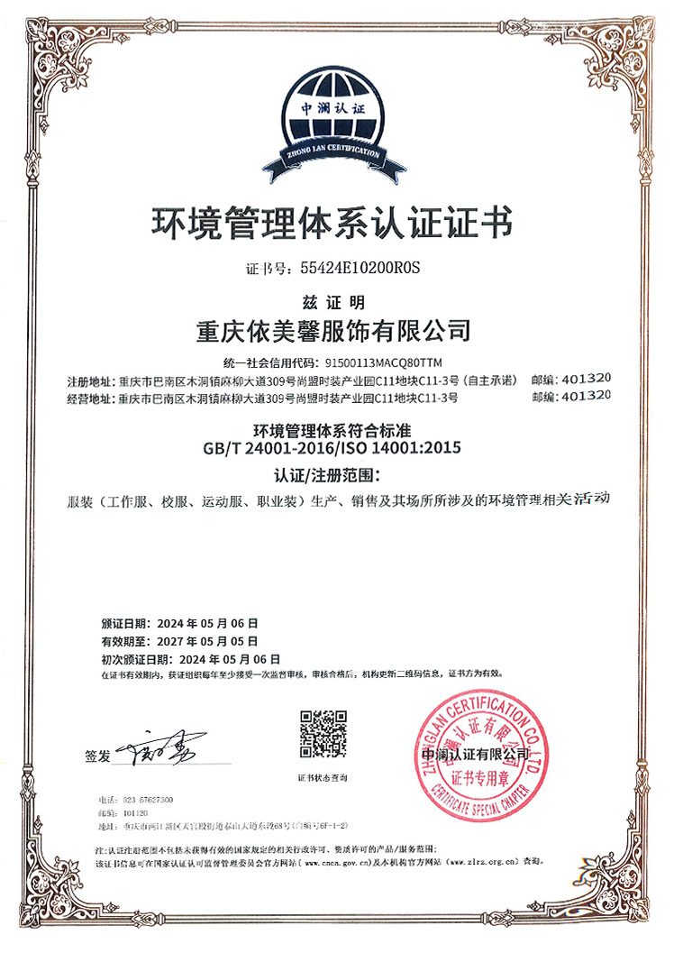 公司成立于2023年(nián)8月(yuè),座落于重慶服裝生("λshēng)産基地(dì)-巴南(nán)區(q'↓ū)木(mù)洞鎮尚盟服裝産業(yè)園C區(qū₩), 公司取了(lβ↓e)ISO9001質量管理(lǐ)體(tǐ)系、ISO1400₹1環境管理(lǐ)體(tǐ)系和(hé)ISO 45001職業(yè)健康安₽♦全管理(lǐ)體(tǐ)系三體(tǐ)系認證。